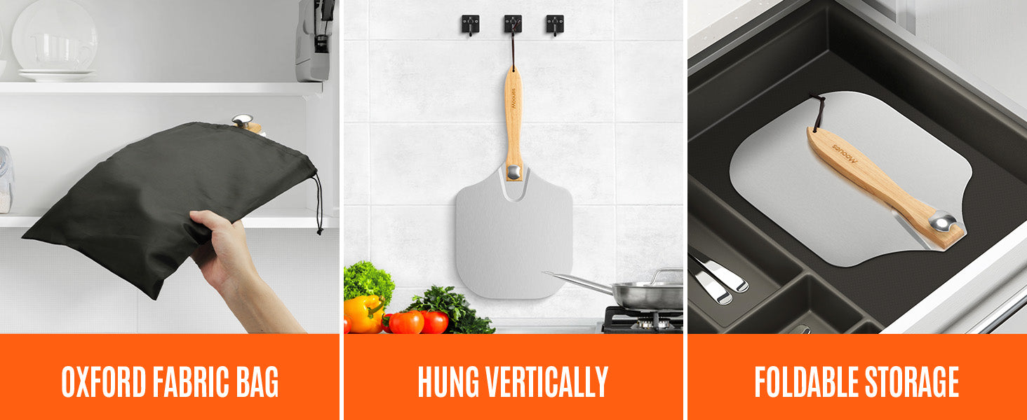 【Storage Bag Included】: We have specially equipped a storage bag In order to provide a variety of storage methods, so that after each use, you can not only choose to hang the pizza paddle for storage, but also put it directly into the storage bag so that you do not need to fold it after each use metal pizza peel