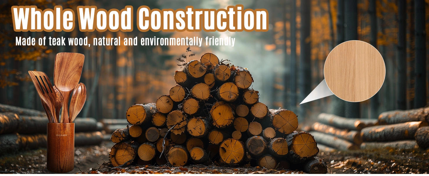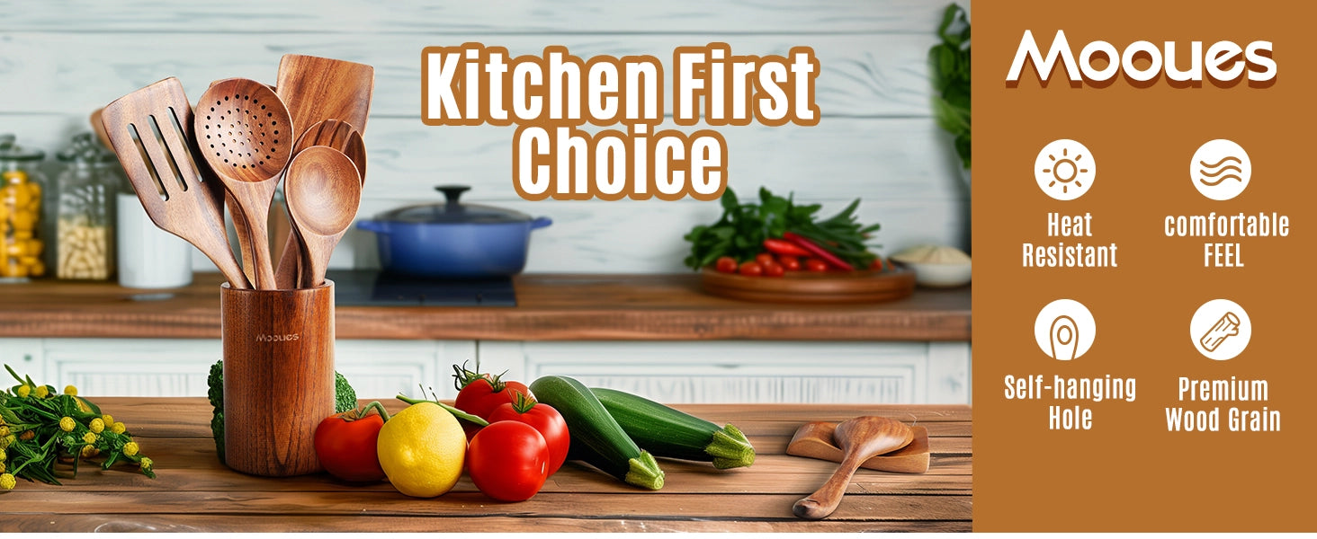 - Natural Teak Wood: Our wood cooking utensils set is made of natural solid teak, which is healthy and safe. Teak is densely grained, hard, and will not crack that it one of the most durable woods, stronger than silicone or bamboo. Wooden kitchen utensils are sanded by hand many times, and the surface is smooth will not hurt any cooking tools.